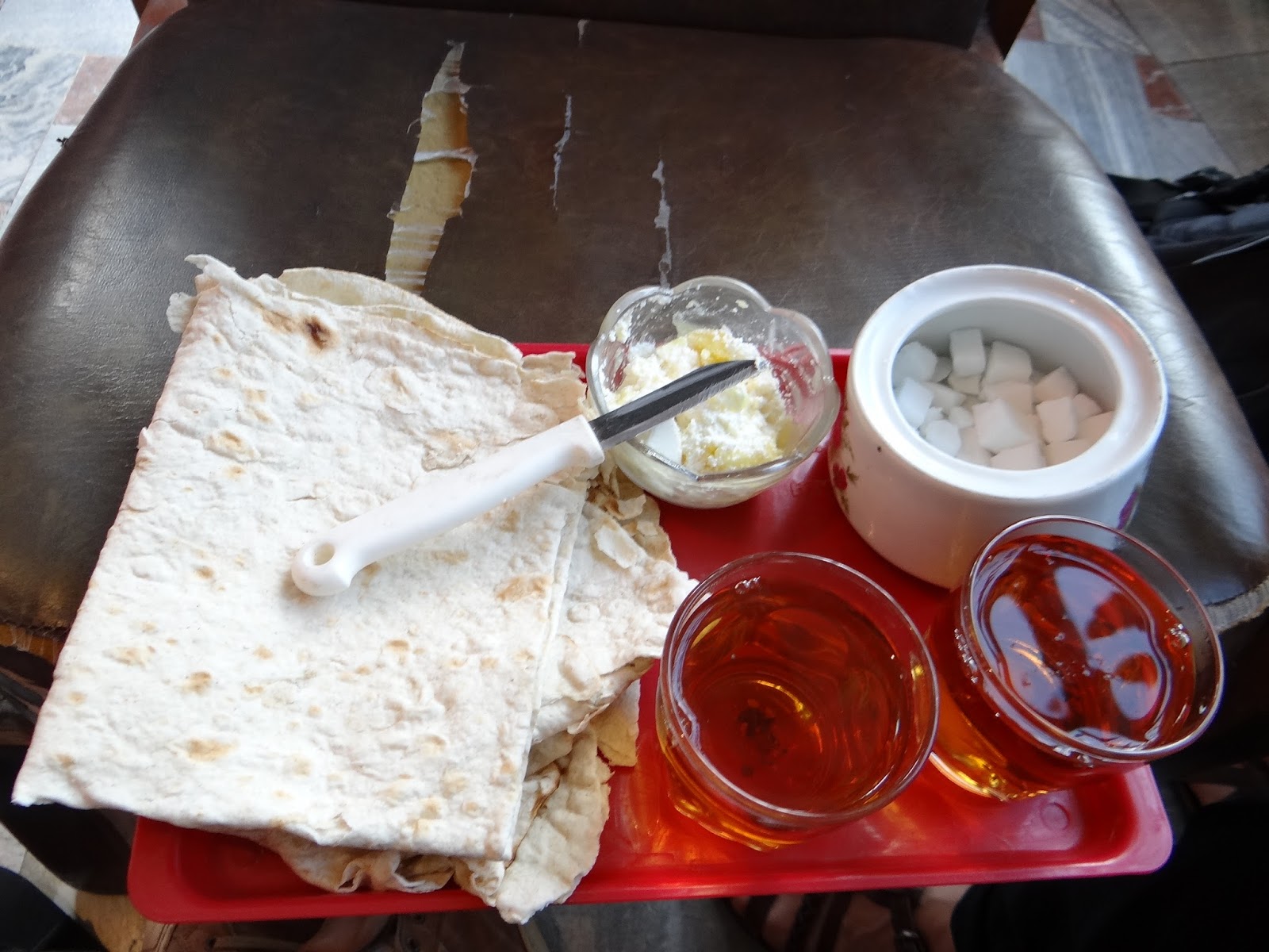 Comprados os bilhetes a menina que nos atendeu (muito simpática mas que pouco falava inglês) ausenta-se e não percebemos porquê até ao momento que ela volta. Tinha ido ao café ao lado buscar o que nos parecia ser o pequeno-almoço, e era para nós !!! espantados perguntámos quanto era, “Please, nothing it’s ok, welcome to Iran”.